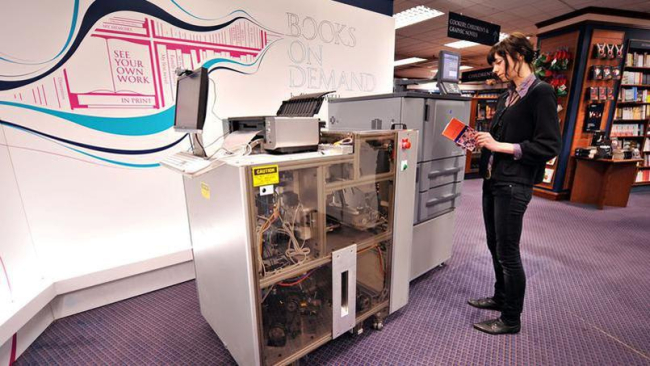 В книжном магазине размещена машина-робот для печатания книг, разработанная американской корпорацией Xerox. В распоряжение клиентов в магазине предоставлены планшеты, с помощью которых можно выбрать книгу из 5 тысяч, представленных в фонде.