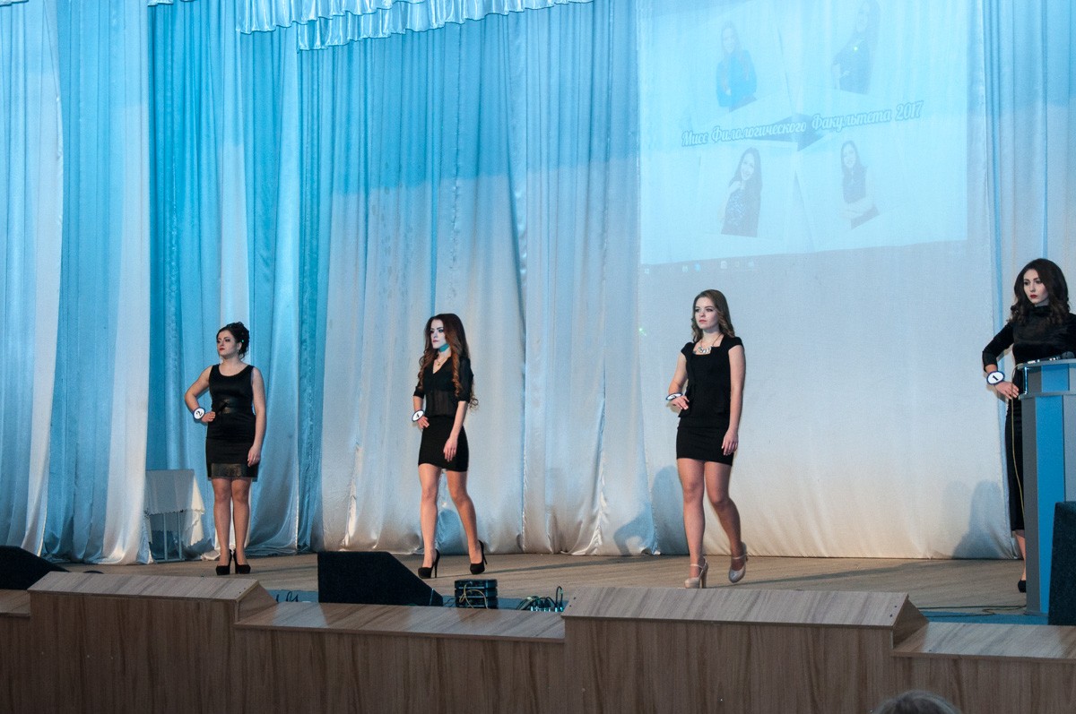 За титул «Мисс филологического факультета» боролись 4 красавицы. Жюри предстояло выбрать самую достойную девушку после трёх отборочных этапов: «визитная карточка», «конкурс талантов» и «интеллектуальный конкурс».