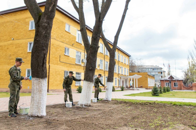 В воинских частях и учреждениях запланирован большой объем работ. В частности, уже был наведен порядок на прилегающих территориях, скошена трава, убран мусор. После этого военнослужащие приступили к побелке бордюров и заборов.