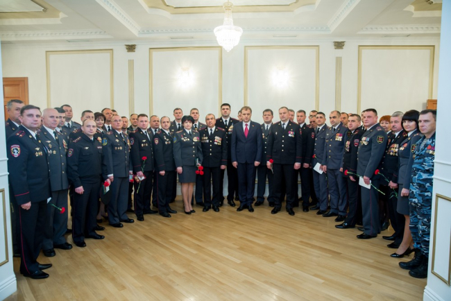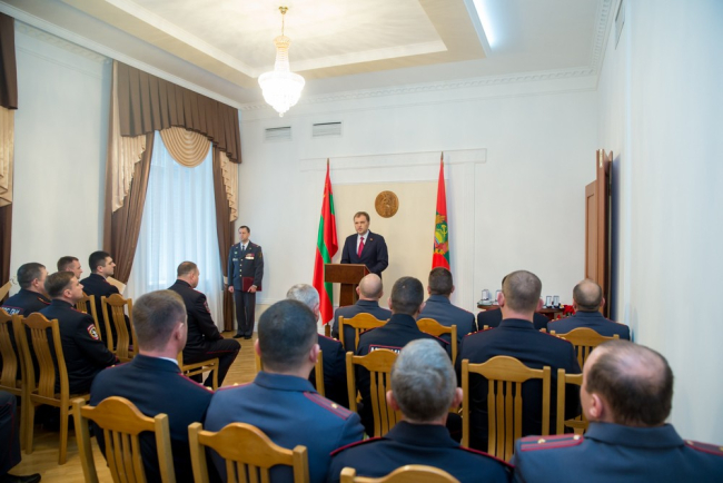 За достижение высоких результатов в служебной деятельности, добросовестное выполнение служебного долга, профессионализм и в связи с 25-летием со Дня образования милиции Приднестровья Президент удостоил наиболее отличившихся сотрудников ведомства государственных наград. Кроме того, сегодня ряду представителей органов внутренних дел были присвоены специальные воинские звания.