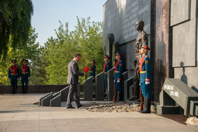 От имени всего народа Приднестровья цветы к Вечному огню, памятникам и мемориальным плитам возложил Президент Приднестровской Молдавской Республики Вадим Красносельский, принявший участие в памятном мероприятии, организованном на столичном Мемориале Славы.