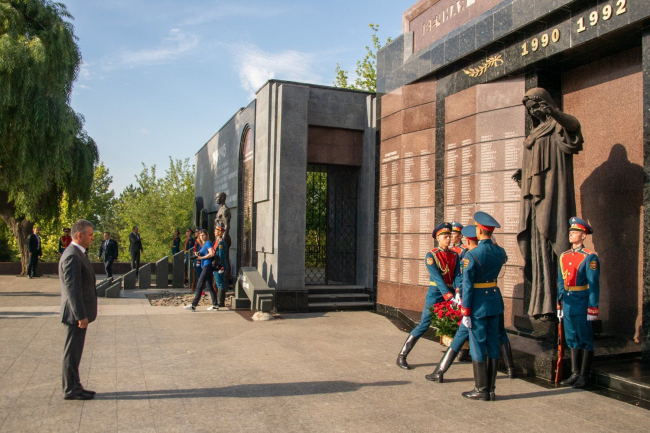 По завершении траурно-памятной церемонии на столичном Мемориале Славы Президент ПМР возложил цветы к установленному на тираспольском кладбище «Новом» памятнику павшим в 1992 году.