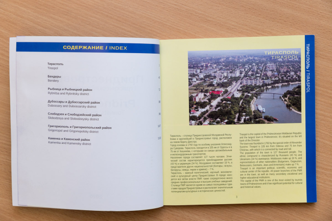 Издание рассказывает о главных достопримечательностях, музеях, парках, предприятиях, спортивных объектах, ресторанах и гостиницах от Тирасполя до Каменки