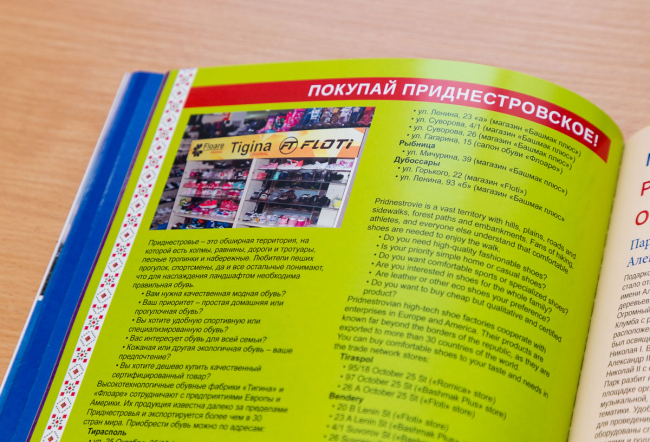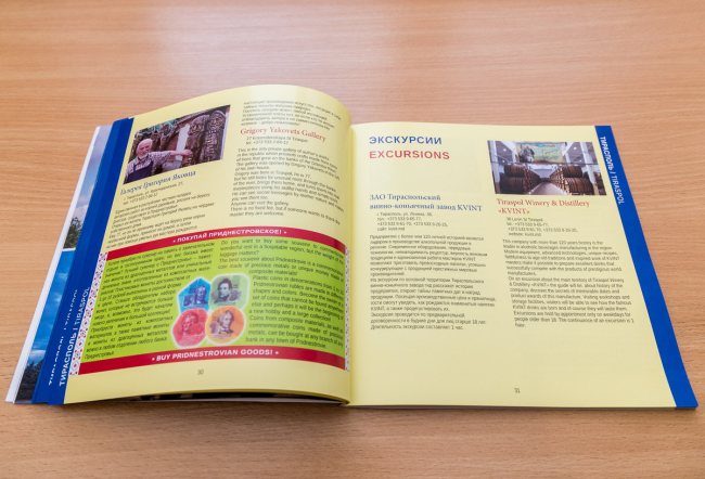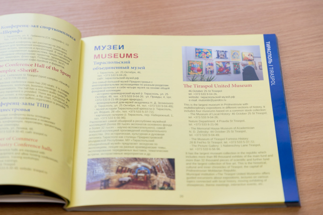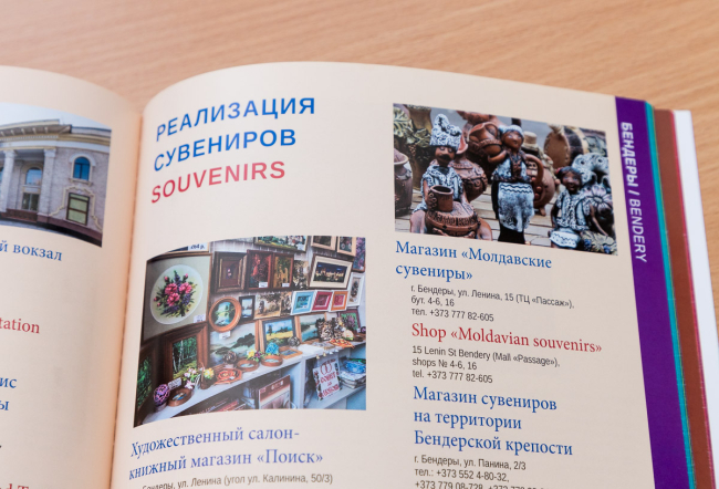 Кроме этого, в справочнике указаны места, где турист может приобрести сувениры в память о Приднестровье.  Информация доступна на русском и английском языках.