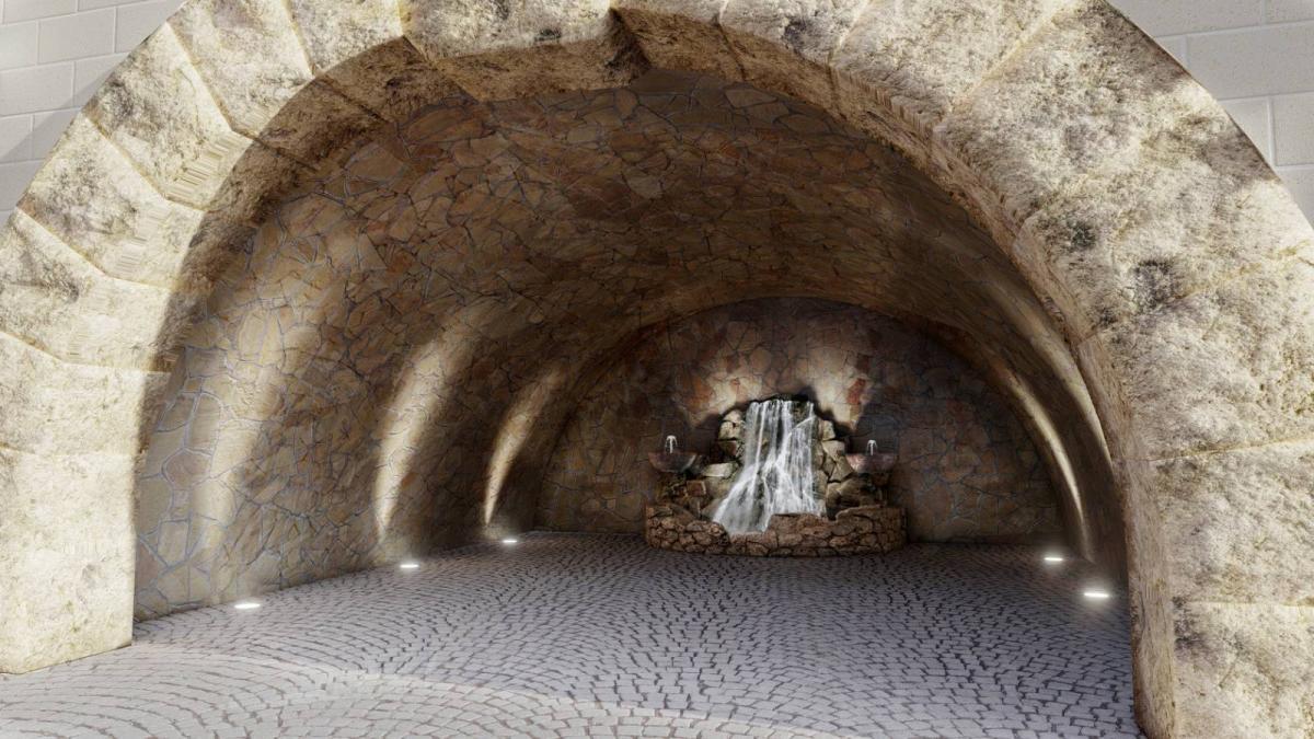 Сразу за ступенями, ведущими к верхней части трибуны, возводится грот, где будет обустроено место отдыха с источником воды в виде небольшого водопада.