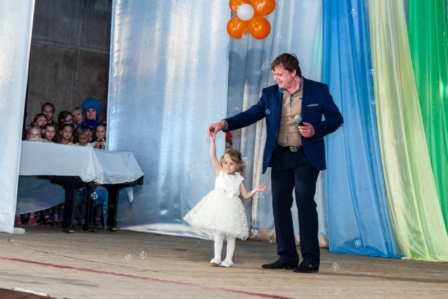 На сцене выступают виновники торжества, некоторые номера они исполняют вместе со своими родителями.