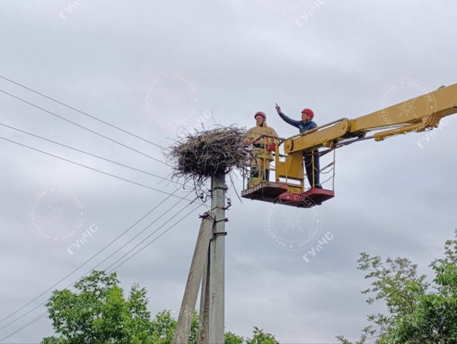Сегодня аистёнка подняли в гнездо на специальной вышке (её предоставили электросети). Спасатели осторожно, чтобы не задеть линии электропередач, посадили птенца в гнездо, сообщает пресс-центр МВД ПМР.