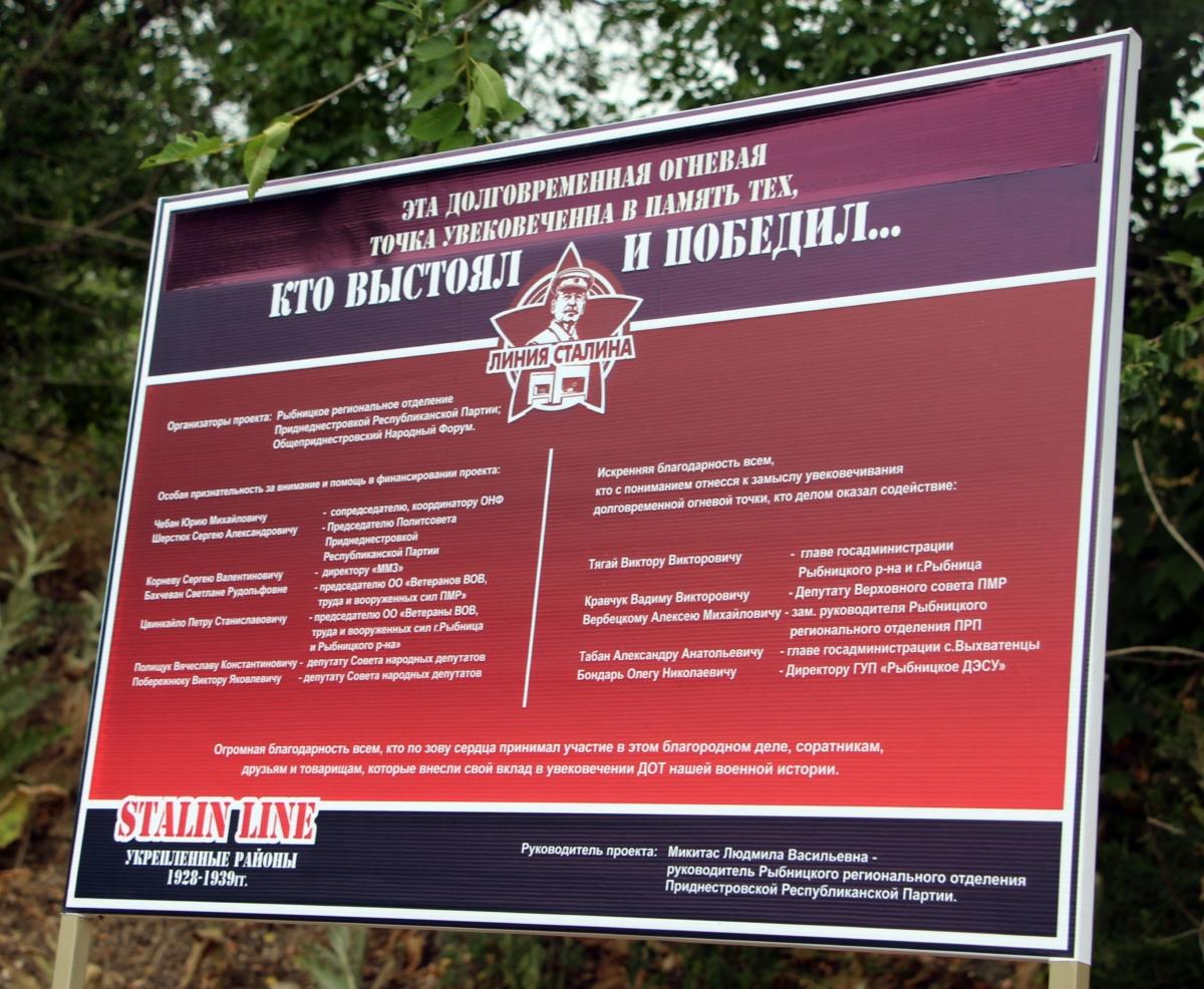 Напомним, что увековечивание ДОТ было предложено на собрании членов Рыбницкого отделения Приднестровской Республиканской партии в мае 2018 г. её молодежным движением. Результаты работ: проведена дорога, которая ведет к ДОТу, произведена уборка прилегающих территорий, осуществлены работы по изготовлению и установке ограждения.