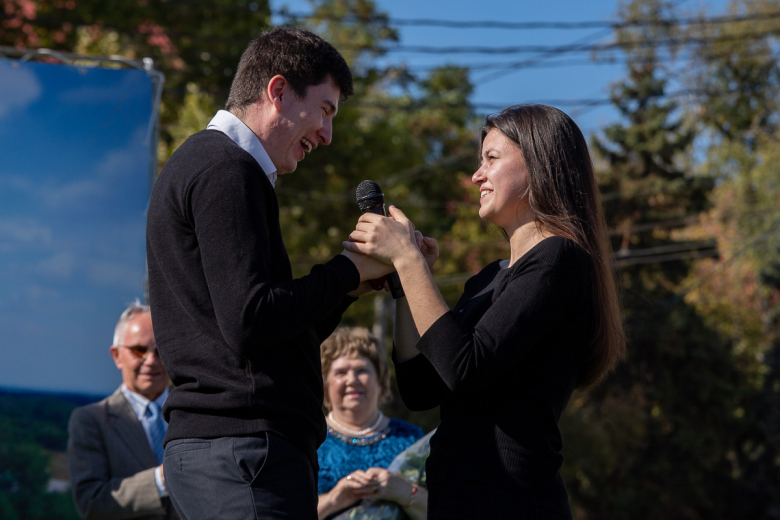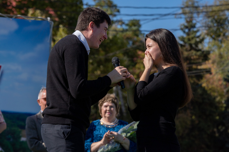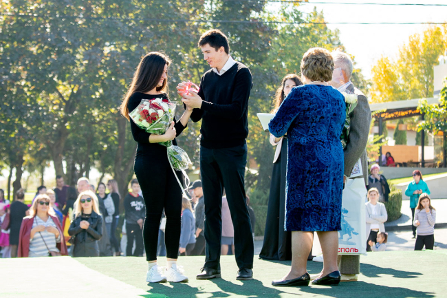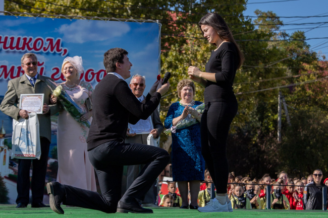 Чествование супружеских пар закончилось большим сюрпризом для всех зрителей, а особенно для одной девушки стоящей в их числе. Когда Лена увидела своего парня Влада на сцене, она не сразу поняла, что происходит. Оказалось, что это был сюрприз для неё, за которым последовало предложение руки и сердца.