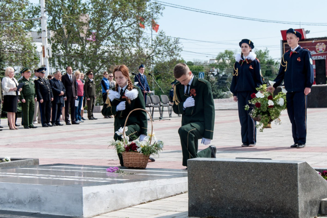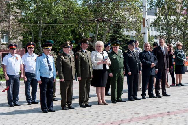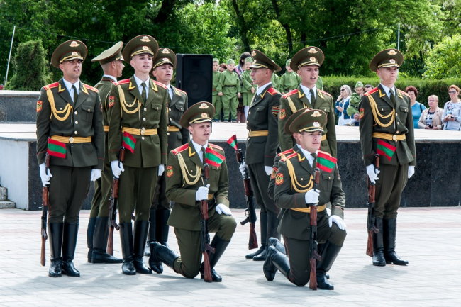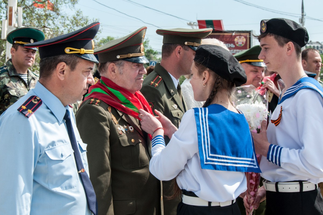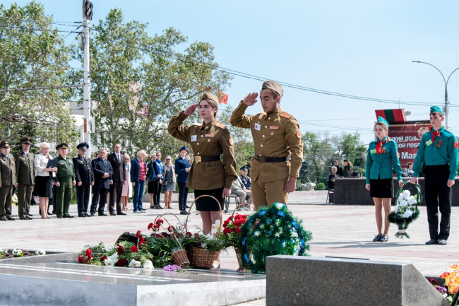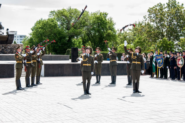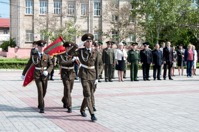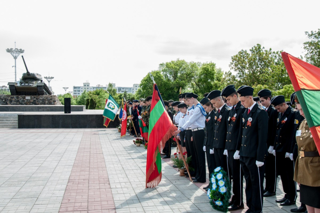 Минутой молчания участники торжественного митинга почтили память павших защитников Отечества и возложили к мемориальным плитам живые цветы. Затем вручили ветеранам, защитникам Приднестровья и почетным гостям символы республиканского детского молодежного движения «Юный патриот Приднестровья» — галстуки цветов государственного флага ПМР.