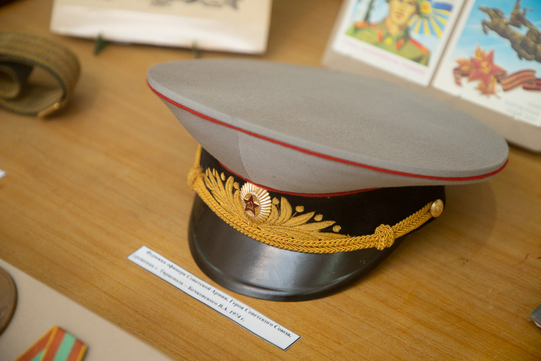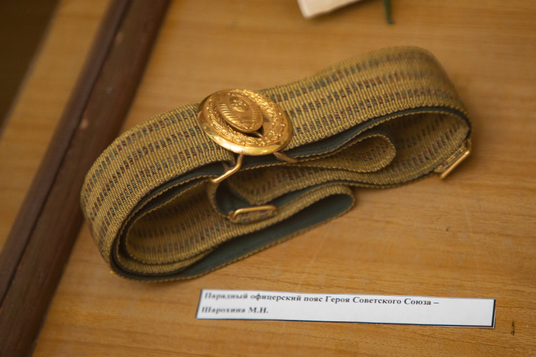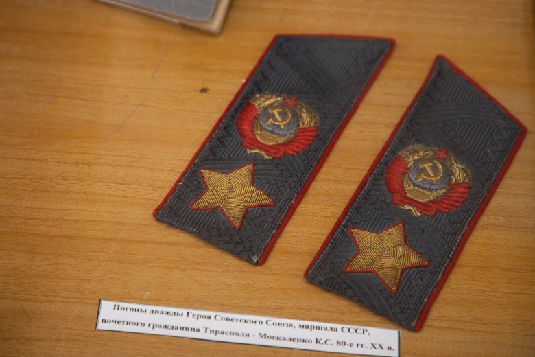 По её словам, наибольшую ценность и значимость в выставке представляют личные вещи героев Советского Союза. Это фуражка офицера танковых войск, уроженца Тирасполя Владимира Бочковского, парадный офицерский ремень генерал-полковника, почетного гражданина Тирасполя Михаила Шарохина и погоны маршала СССР, почетного гражданина Тирасполя Кирилла Москаленко .