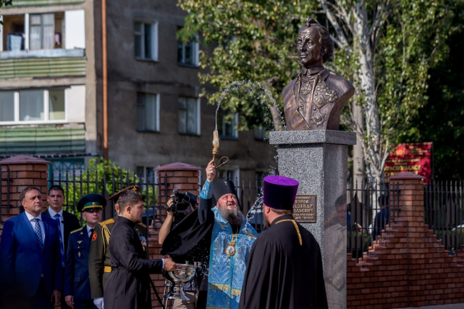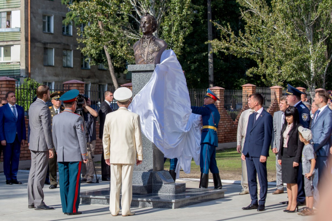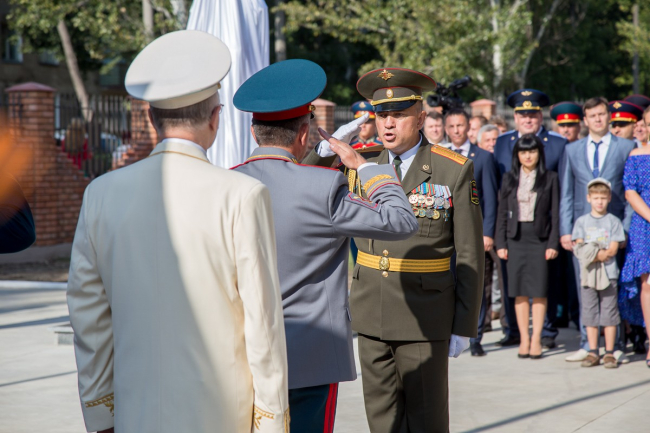 Началась церемония открытием на территории училища памятника великому русскому полководцу А.В. Суворову, прослужившему более полувека в русской армии. За это время он провёл 20 походов, свыше 60 сражений и боёв, из которых всегда выходил победителем. Скульптором памятника является Вячеслав Москаленко из творческой мастерской «Везувий».