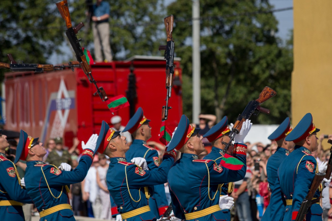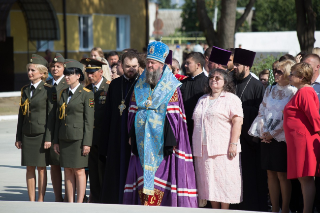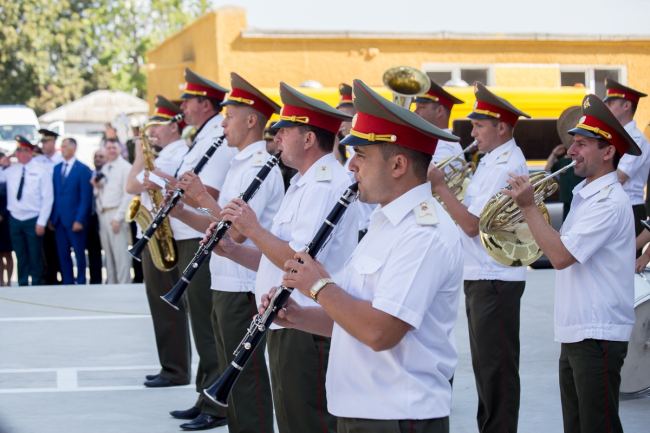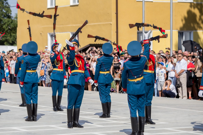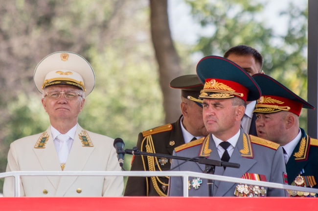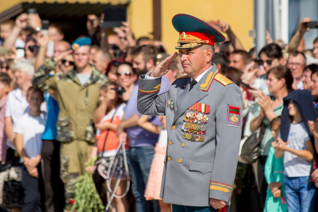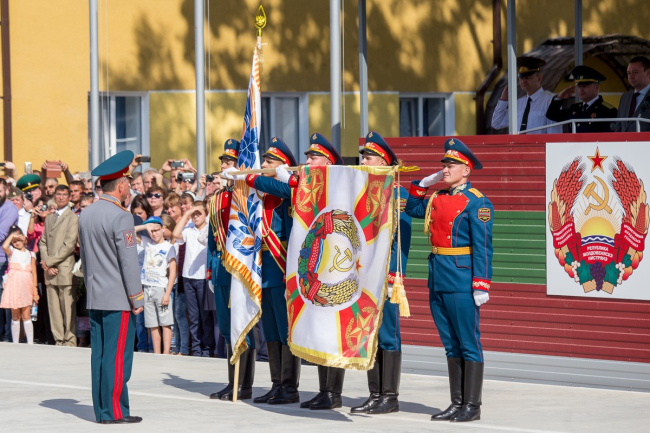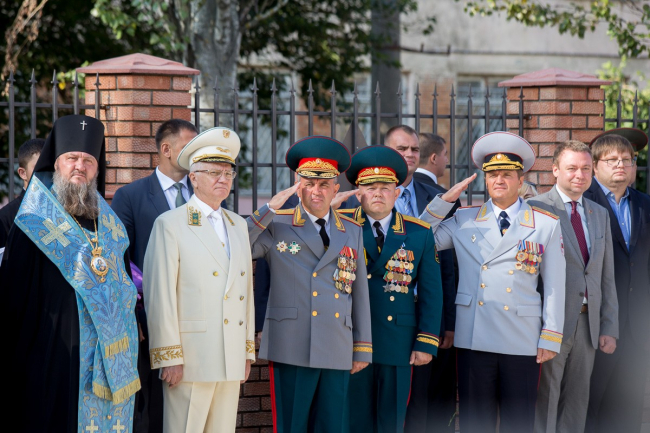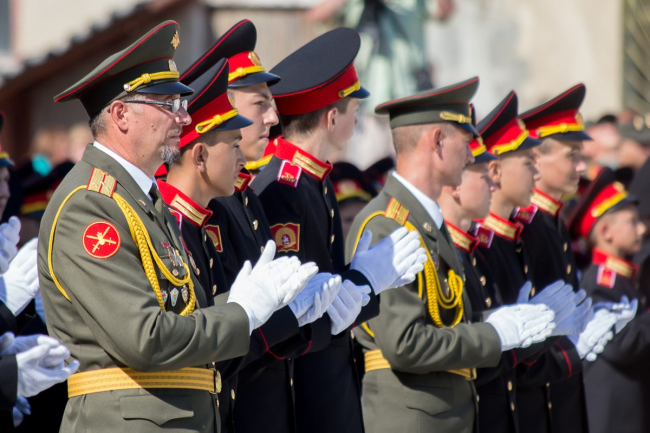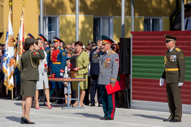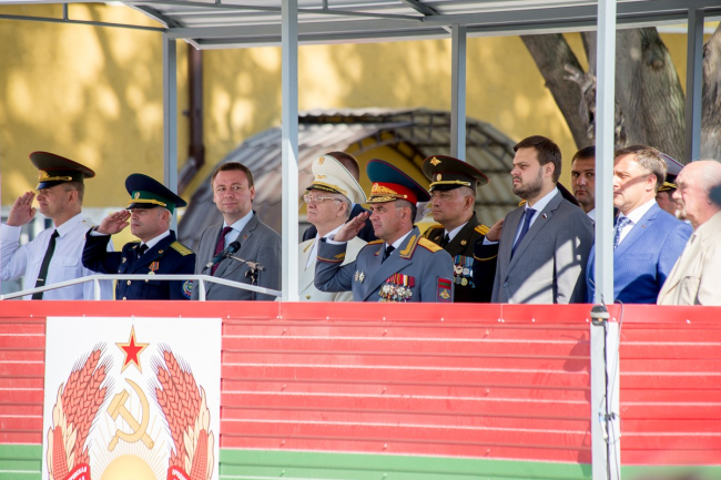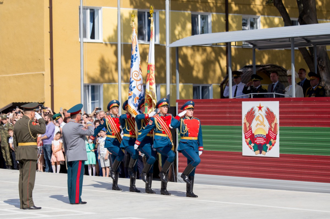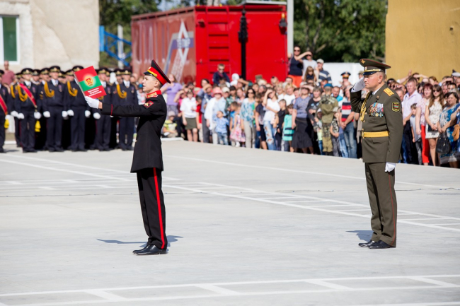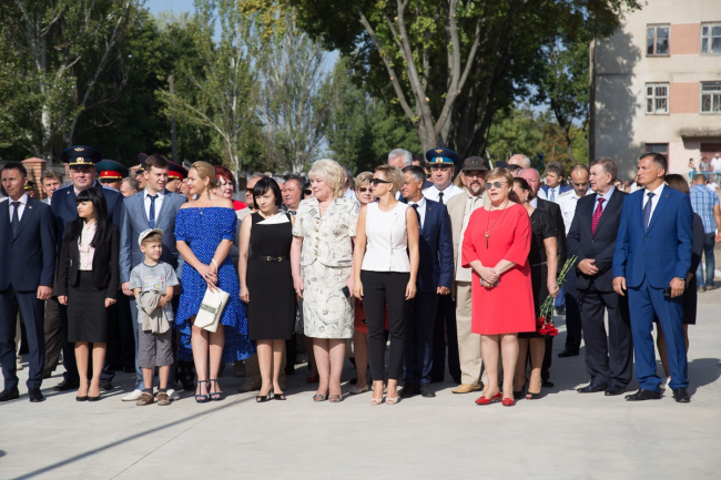 После возложения цветов к подножью монумента Президент ПМР Вадим Красносельский и начальник Тираспольского Суворовского военного училища Сергей Александров разрезали красную ленту и таким образом официально открыли учебное заведение.