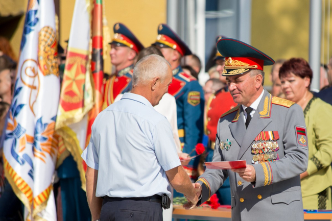 Не обошлось в этот день без подарков. Российский посол вручил руководству учебного заведения сертификат на получение компьютерной техники, а также историческую и военную литературу, которая пополнит библиотеку училища. От Государственного таможенного комитета ТСВУ получило два автомобиля.