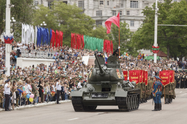 Тирасполь, 9 мая. /Новости Приднестровья/. В приднестровской столице начался военный Парад в честь 73-й годовщины Победы в Великой Отечественной войне. По главной площади Тирасполя проехал легендарный танк Т-34 с точной копией Знамени Победы.
