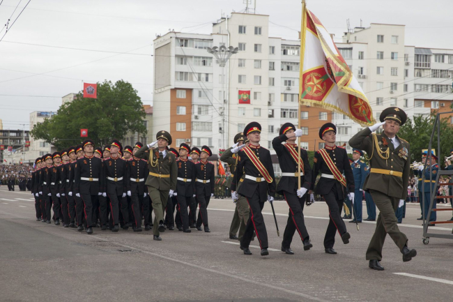 Далее парадным маршем перед гостями праздника пройдут десять парадных расчетов, в том числе курсанты Военного института в форме времен Великой Отечественной войны и штандартами всех фронтов.  Впервые в нём примут участие воспитанники Тираспольского Суворовского военного училища.