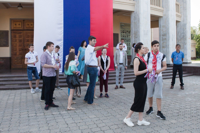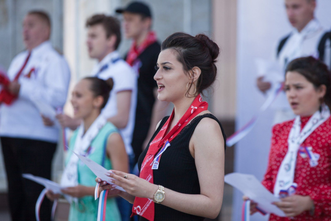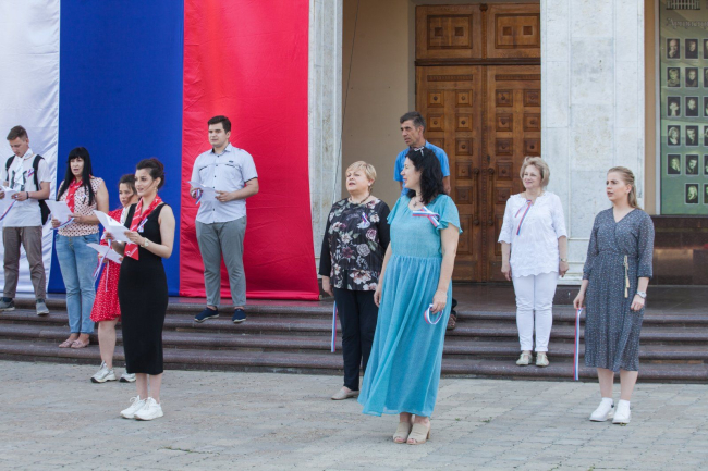 Молодёжь устроила флешмоб и спела российский гимн. То, что у драмтеатра празднуют День России, было видно издалека: на фасаде здания развевался семиметровый российский флаг, сообщает пресс-служба Верховного Совета.