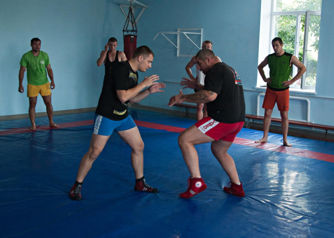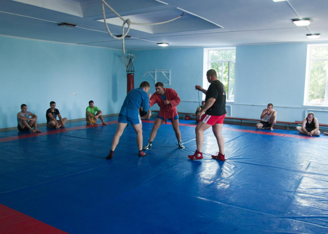 Первые тренировки по боевому самбо с военнослужащими прошли весной, на этот раз тренеры вспомнили ранее отработанные и добавили новые удушающие, бросковые приёмы.