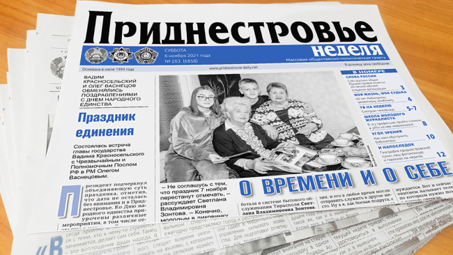 Также корреспонденты издания расскажут о юбилеях Союза русских общин Приднестровья и Рыбницкого цементного комбината