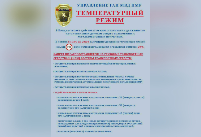 01 Июл., 2024, 14:16Тирасполь, 1 июля. /Новости Приднестровья/. Ограничение на передвижение по дорогам общего пользования при температуре воздуха свыше 29 градусов действует в Приднестровье. В этом случае, как сообщила пресс-служба МВД ПМР, с 10 до 20 часов запрещается движение грузовиков массой более 20 тонн.