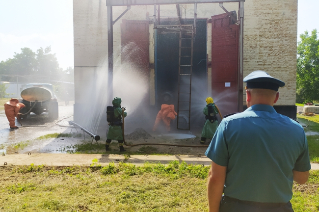По легенде из-за обрыва троса во время разгрузочных работ упал баллон с жидким хлором, при ударе произошла его разгерметизация. Аварийно-техническое формирование приступило к ликвидации ЧС. Чтобы прекратить распространение газа вокруг здания, где произошла утечка, включили водяную завесу. Прибывшие пожарные дополнительно залили контейнер водой. Затем работники Водоканала опустили его в специальный саркофаг.