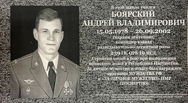 05 Авг., 2024, 17:28Тирасполь, 5 августа. /Новости Приднестровья/. 7 августа в 10 часов во дворе тираспольской школы № 14 пройдет церемония открытия мемориальных досок в память о бывших учениках школы, офицерах Вооруженных сил РФ, кавалерах российского ордена Мужества и приднестровского ордена «За личное мужество» лейтенанте Андрее Боярском и старшем лейтенанте Максиме Майорове, геройски погибших при выполнении воинского долга во время контртеррористической операции в Чечне.