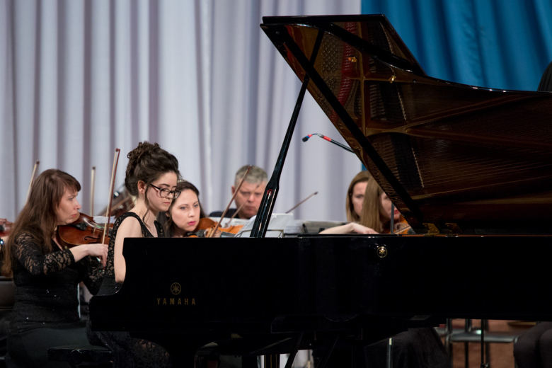 Звучит последний звонок. На сцене появляется оркестр. Ведущая объявляет: «Вольфганг Амадей Моцарт, фортепианный концерт номер 4 в трех частях. Солистка – Полина Трофим».