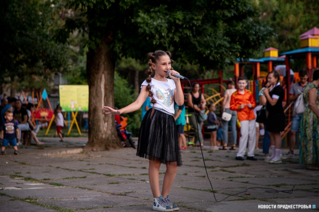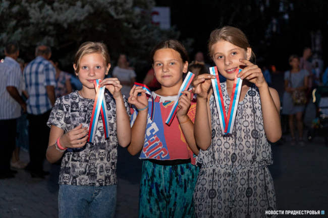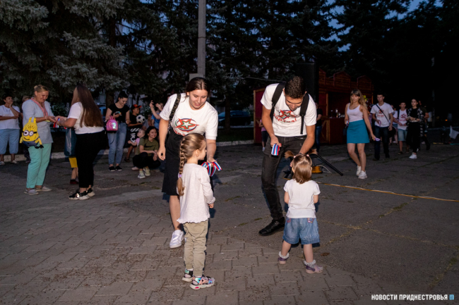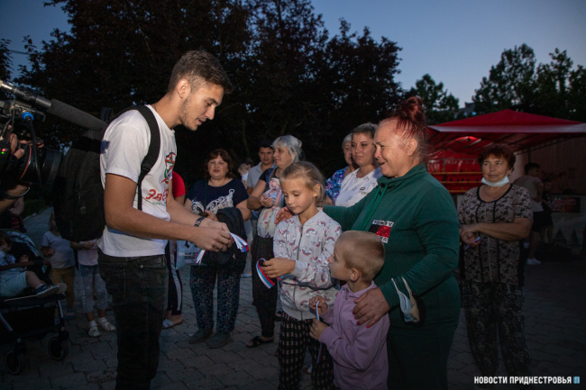 Продолжился концерт известными песнями под гитару в исполнении активистов «Звезды». Они также растянули в сквере большой российский флаг. Помогали в этом юные приднестровцы. Любой желающий мог сфотографироваться на фоне флага РФ.