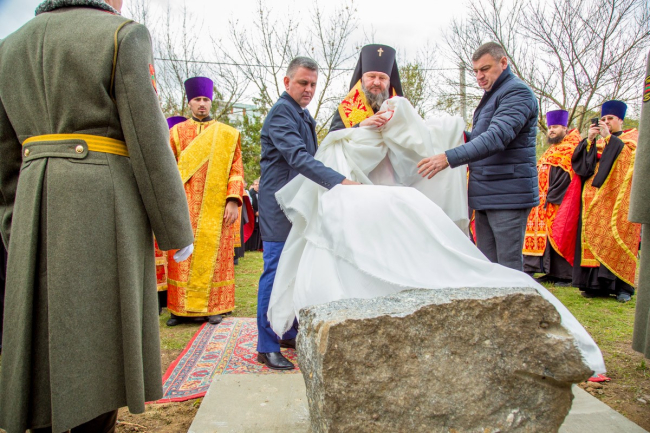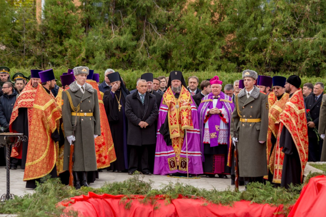 Затем Глава государства, руководители органов государственной власти, представители духовенства, общественных организаций, родственники репрессированных приняли участие в церемонии освящения камня для закладки Храма в честь новомучеников и исповедников Церкви Русской.