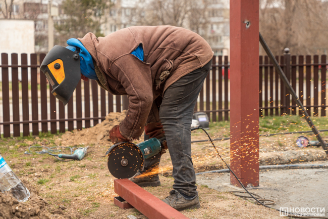 Колокола привезли ещё прошлым летом. Звонницу начали сооружать в начале этой недели. Уже залит фундамент. Рабочие монтируют металлическое основание. Потом займутся установкой колоколов – всего их будет 7.