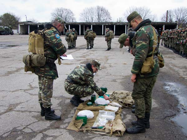 Проверка началась со строевого смотра. Офицеры-члены комиссии Министерства обороны проверили внешний вид военнослужащих, наличие и правильное оформление документов, а также содержание вещевых мешков.