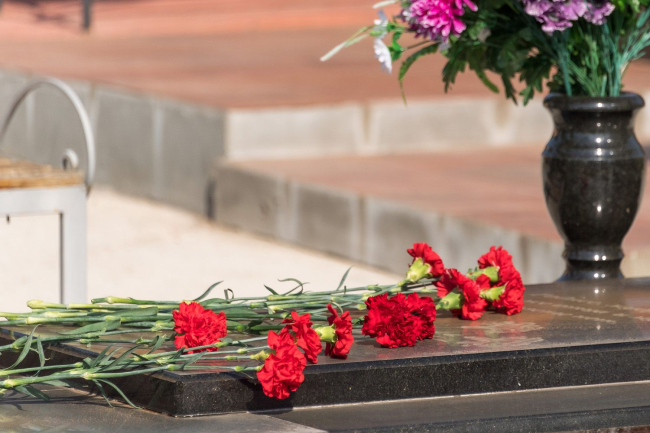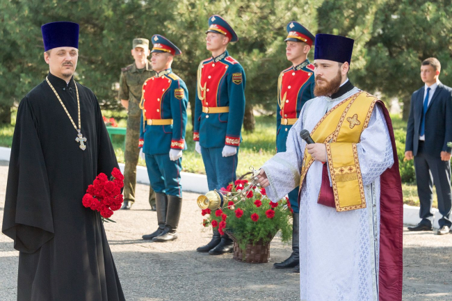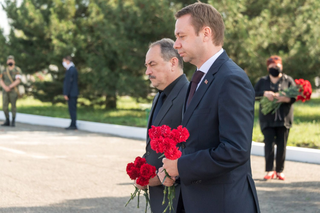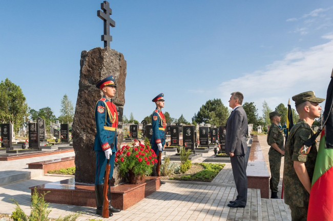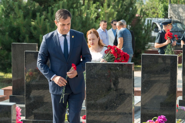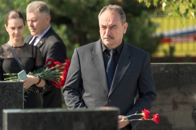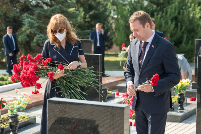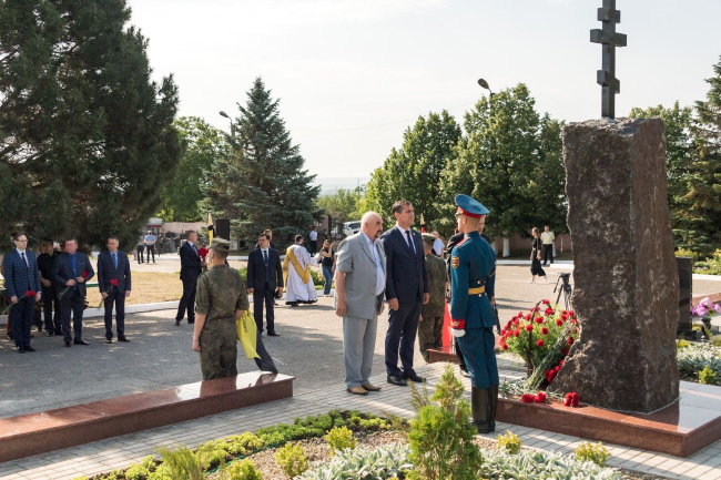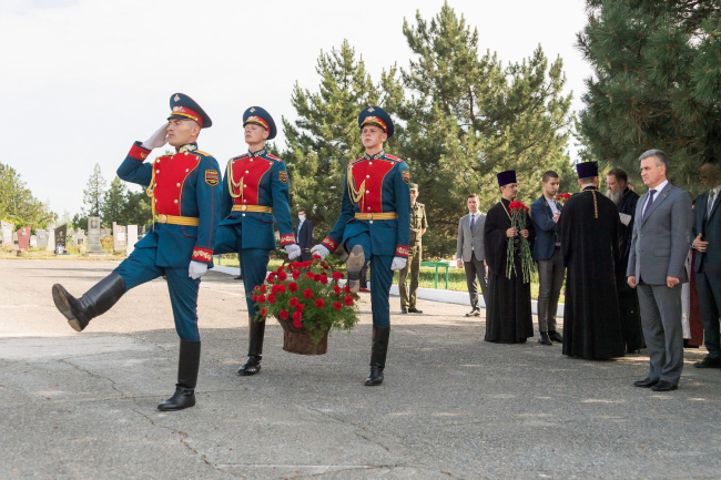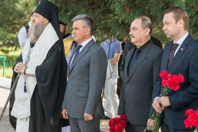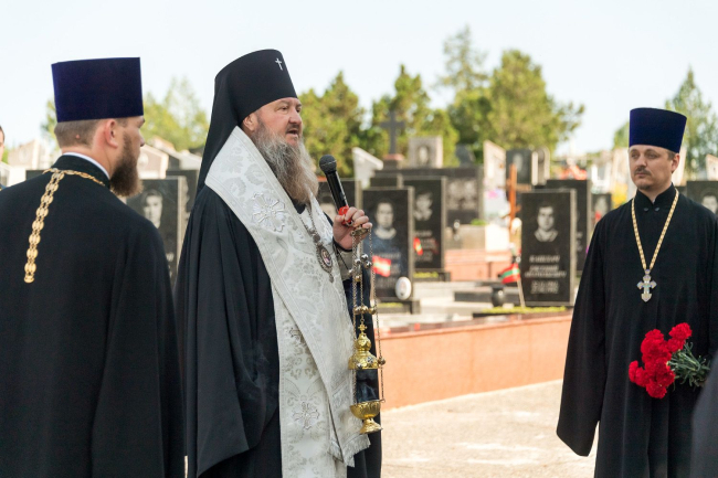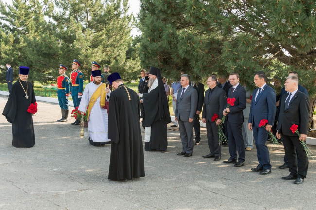 По окончании литии Вадим Красносельский возложил цветы к памятнику защитникам и к каменным плитам могил, под которыми упокоены герои.