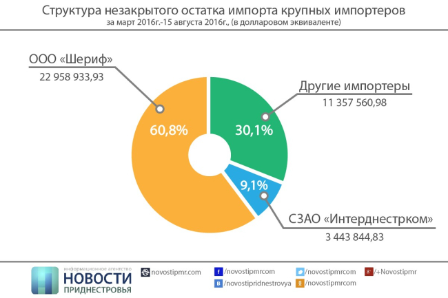 При этом в пресс-релизе ПРБ отмечается, что в период 1 марта по 15 августа 2016 года значительно возрос объём незакрытого импорта ООО «Шериф», составив почти $23 млн, тогда как по данным ПРБ, с 1 октября 2015 по 29 февраля 2016 у данной компании незакрытого импорта практически не было. Из этого можно сделать вывод, что крупнейший импортёр действительно стал закупать значительную часть товаров впрок, с отсрочкой поставки. Если данная компания использует такую схему и при заключении новых контрактов, то этим можно объяснить достаточно большой размер её заявок на приобретение валюты.