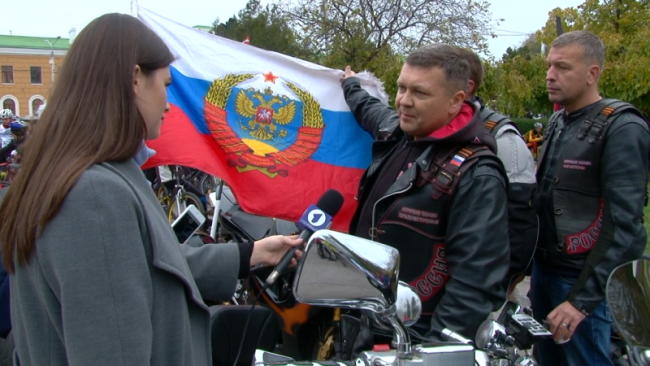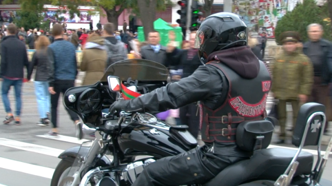 Мотоциклисты были представлены мотоклубом «Ночные волки», приднестровское отделение. Как рассказал его председатель Валентин Кирик, сегодня они приехали с флагом, на котором изображен герб Российской империи, призывающий к объединению стран, входящих в бывший СССР. «Растерянные русские земли собираем по крупицам обратно», - пояснил он, подчеркнув, что дизайн принадлежит Александру Залдостанову – лидеру старейшего в России мотоклуба «Ночные волки».