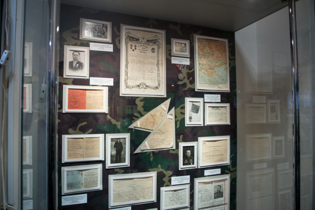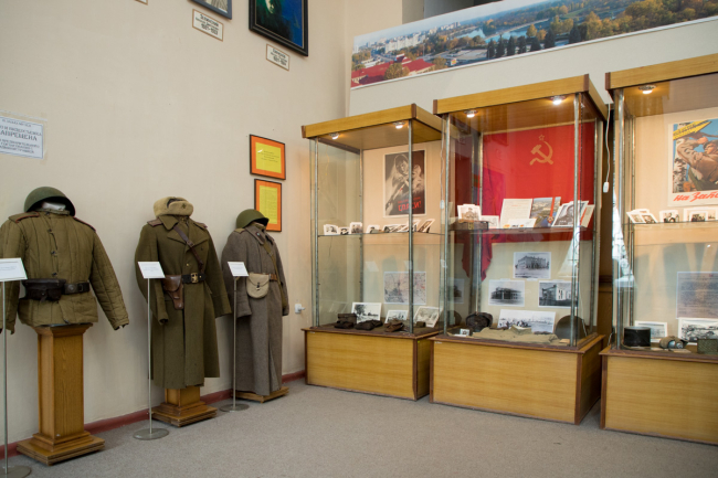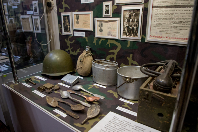 В экспозиции можно увидеть фотоматериалы, документы, личные вещи бойцов, а также снаряжение и униформу Красной армии того периода.
