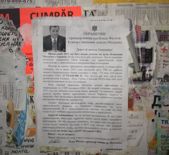 Такой призыв содержат листовки, распространяемые в Кишинёве якобы от имени премьер-министра Владимира Флата. В них неизвестный автор объясняет ситуацию с внешним государственным долгом страны.