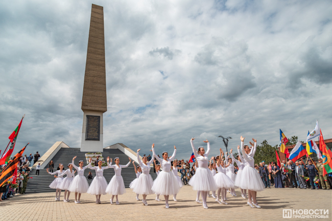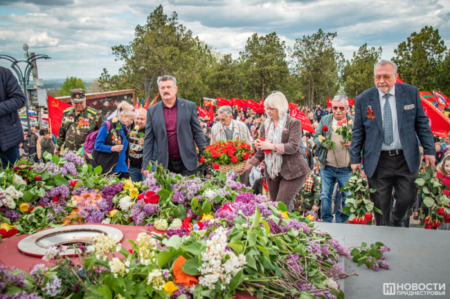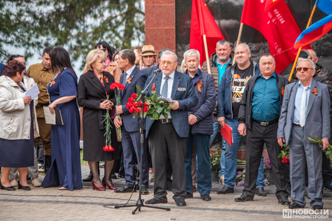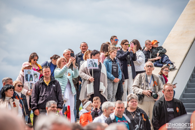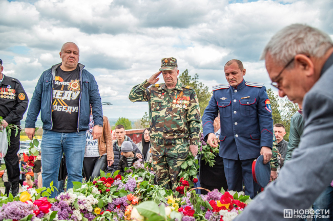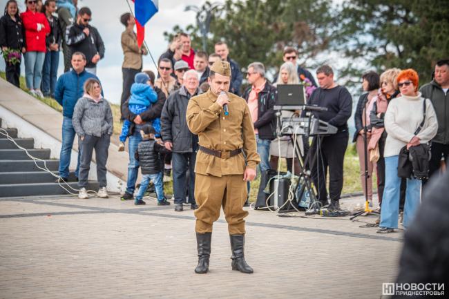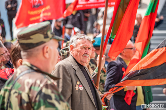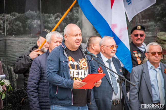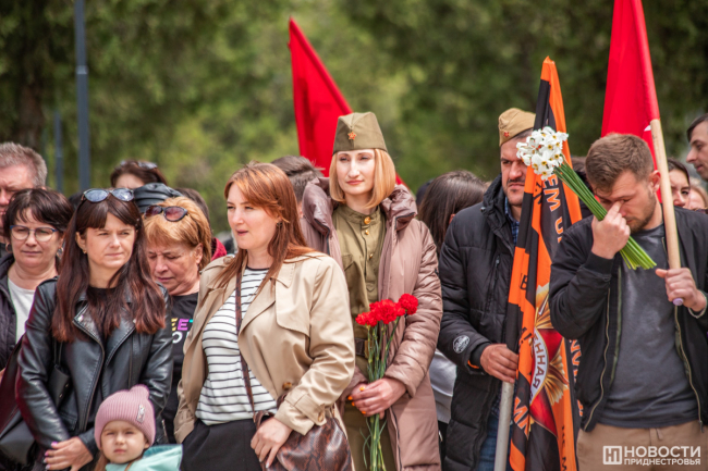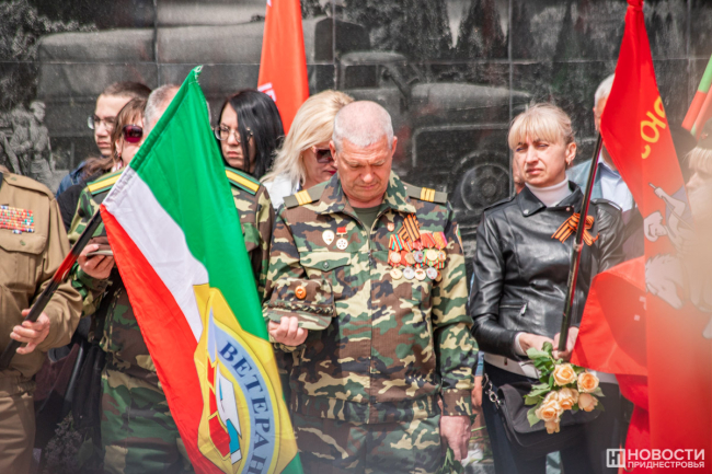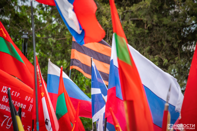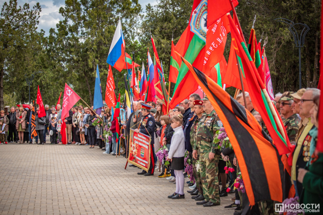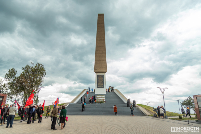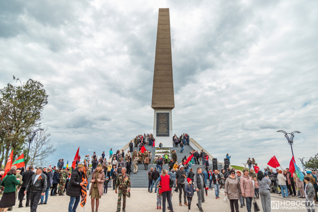 У подножия стелы провели митинг. На небольшой площадке смешались события и эпохи: в одном ряду сошлись флаги советской Молдавии, России, Приднестровья, Молдовы, копии знамени Победы, стяги со Святым Георгием и даже Георгиевский флаг.