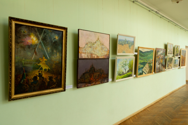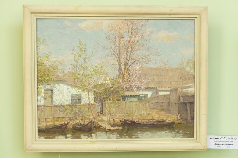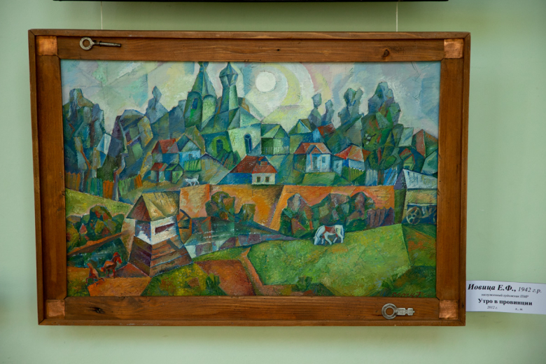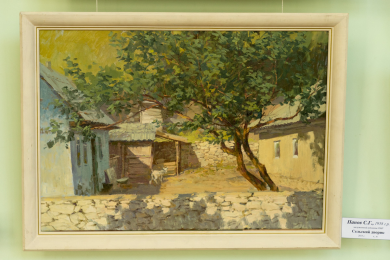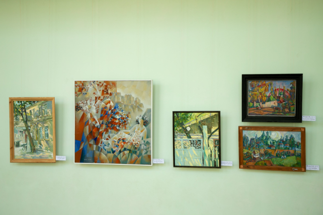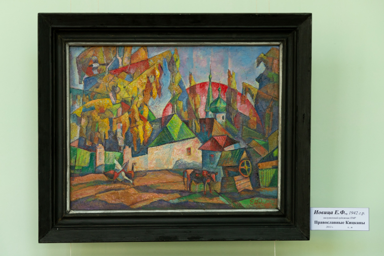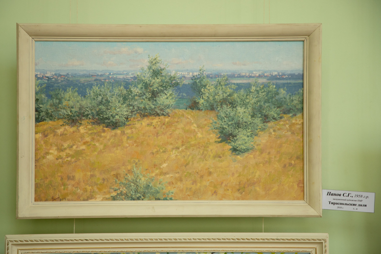 В работах «Православные Кицканы» и «Утро в провинции» заслуженного художника ПМР Евгения Иовицы – яркие пейзажи, словно выложенные живописной мозаикой. Соседствуют с ними произведения реалистической школы заслуженного художника ПМР Сергея Панова «Сельский дворик» и «Тираспольские дали».
