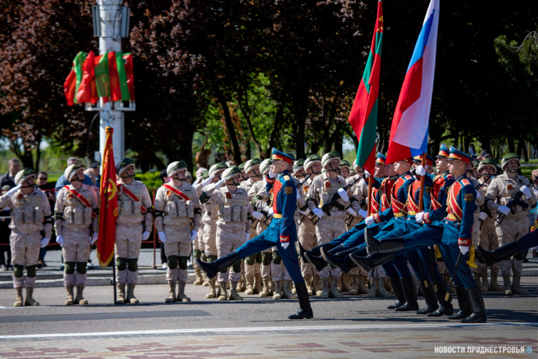 Перед началом Военного парада под музыку композитора Александрова «Священная война» военнослужащие роты Почетного караула вынесли на площадь Суворова государственные флаги Приднестровской Молдавской Республики, Российской Федерации и Знамя Победы.