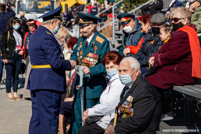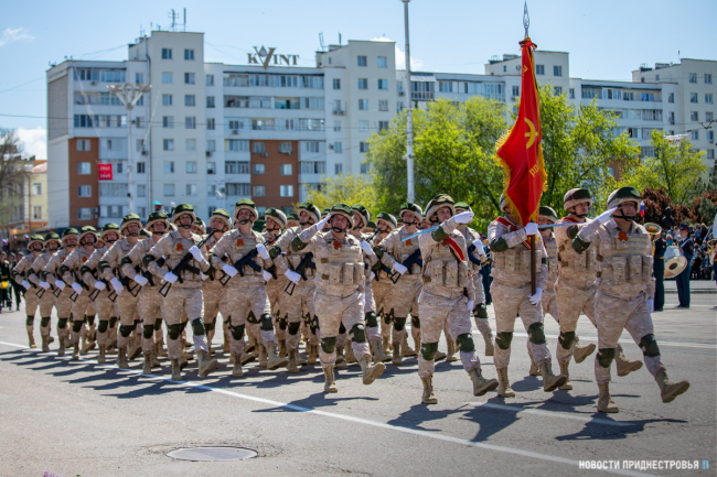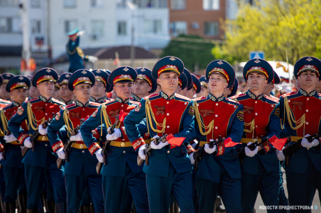 За ними строевым шагом прошли военнослужащие Вооружённых сил ПМР, Пограничного управления МГБ, МВД и подразделений Оперативной группы российских войск в Приднестровье, парадный расчет курсантов Военного института Министерства обороны в форме времен Великой Отечественной войны, а также будущие защитники Отечества – учащиеся Республиканского кадетского корпуса и Тираспольского Суворовского военного училища.