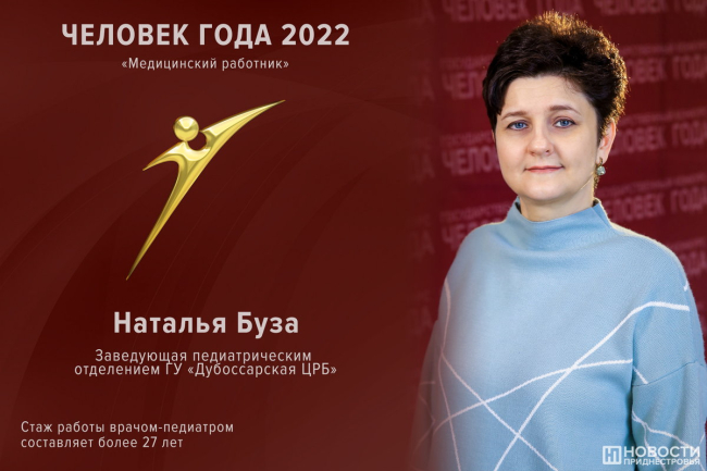 Наталья Борисовна очень добрый, душевный и скромный человек. К своему почетному званию в конкурсе «Человек года - 2022» отнеслась тоже с застенчивостью. Признается, каждый врач достоин этого высокого звания, а ее награда – это заслуга всего коллектива Дубоссарской больницы. Коллектив педиатрического отделения для Натальи Бузы является ее семьей, в которой есть взаимопонимание, поддержка и взаимовыручка.
