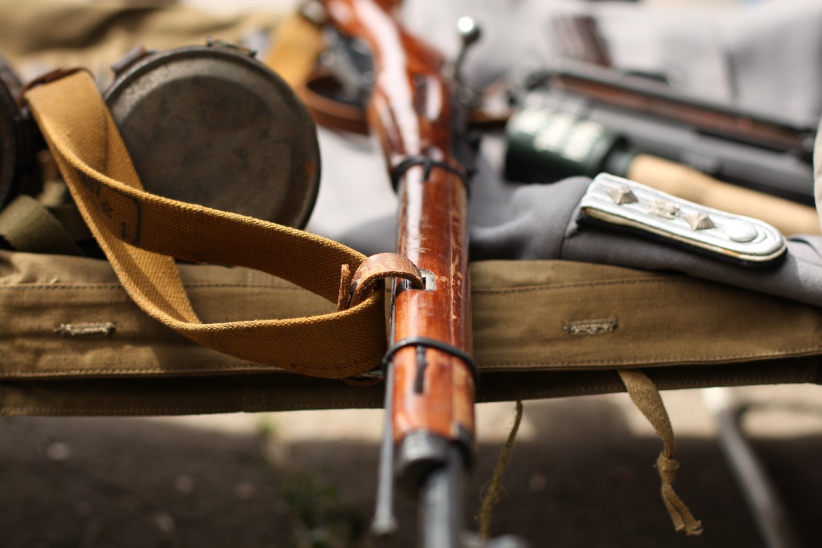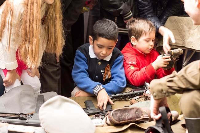 На импровизированных витринах были представлены гранаты образца 1924 года, которыми бойцы Красной Армии «встречали» немцев летом 1941 года, а затем «провожали» их до Берлина. Фляги и саперные лопатки колоритно смотрелись на фоне винтовки Мосина, пистолет-пулеметов Судаева и немецкого МP-40, а также пистолетов «Наган», «ТТ» (Тульский Токарев) и муляжей «Парабелума».