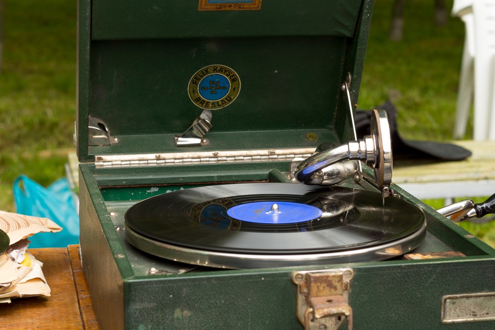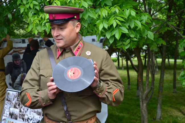 Презентация проходила под аккомпанемент песен 30-40-х годов: на трофейном немецком патефоне крутились виниловые пластинки с хитами и шлягерами тех времен. «Диск-жокеем» оказался один из организаторов выставки: одетый в форму офицера стрелковых частей РККА образца 1941 года он ловко переворачивал грампластинки, охотно отвечая на вопросы любопытствующих посетителей.