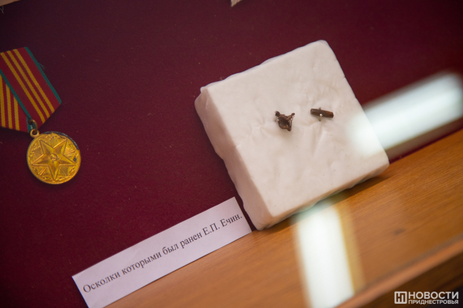 В экспозиции представлены личные вещи и документы погибших защитников Приднестровья. Среди них – портупея и планшет Григория Ечина, его награды, диплом об окончании техникума, книги, капитанский китель с аккуратно заштопанными следами осколков. Лежат в витрине и сами осколки, извлеченные хирургами из тела раненого милиционера.