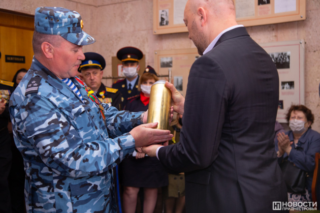 Защитник Приднестровья, председатель общественной организации ветеранов 2-го батальона республиканской гвардии Виталий Фирсов передал директору Бендерского краеведческого музея Александру Тихонову капсулу, которую в Бендеры из Дубоссар доставила «Эстафета памяти». А начальник управления культуры Дубоссарского района и города Дубоссары Светлана Скрикуляк передала в дар музею солдатскую каску, которая использовалась защитниками Приднестровья во время боев под Дубоссарами.