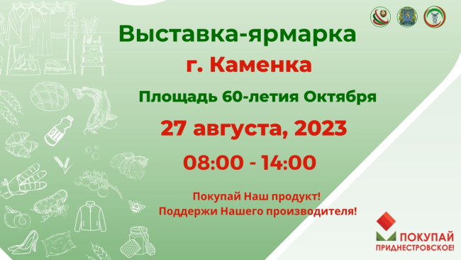 Каменка, 3 августа. /Новости Приднестровья/. 27 августа в Каменке состоится выставка-ярмарка «Покупай приднестровское!». Она будет проводиться с 08:00 до 14:00 на площади 60-летия Октября.