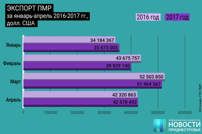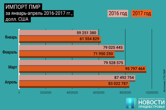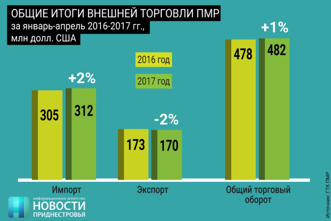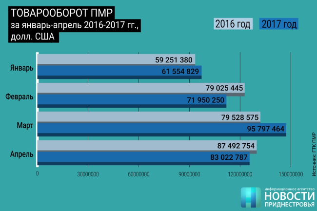 Тирасполь, 22 мая. /Новости Приднестровья/. За январь-апрель этого года товарооборот ПМР вырос на 1% (до $482 млн), по сравнению с аналогичным показателем 2016-го. При этом импорт увеличился на 2% - до $312 млн, экспорт сократился на 2% - до $170 млн. Об этом свидетельствуют данные таможенной статистики, опубликованные на официальном сайте Государственного таможенного комитета ПМР.