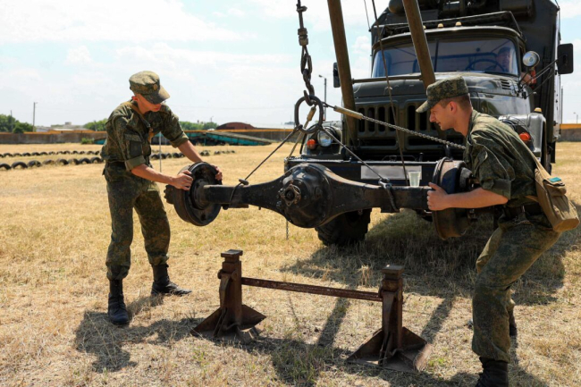 Специалисты-ремонтники в конкурсе «Мастер ремонтного дела» развернули мастерскую технического обслуживания, прошли маршрут протяженностью более трех километров, оборудованный препятствиями, площадками для выполнения специальных работ и отработки нормативов. Лучшим стал экипаж войсковой части 12084.
