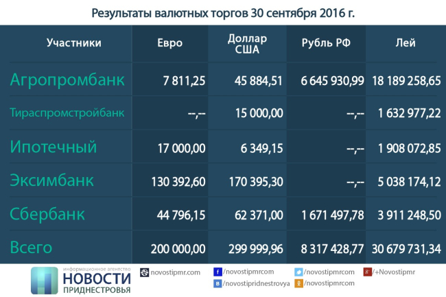 Тирасполь, 30 сентября./ИА «Новости Приднестровья"/. По данным Центробанка, совокупный спрос на торгах валютного аукциона ПРБ составил сегодня 37 296 861.72 долларов в эквиваленте. Предложение Центрбанка, сформированное от обязательной продажи валютной выручки по прежнему не покрывает спрос.