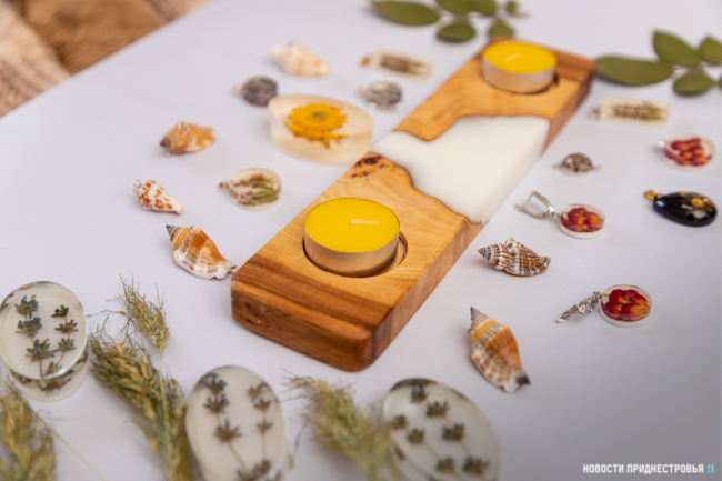 «Муж – мой помощник и генератор идей. Сейчас с его легкой руки мы начали делать новый вид изделий. Это деревянные дощечки, подсвечники. Сочетаем дерево с эпоксидной смолой», - рассказывает Лена.